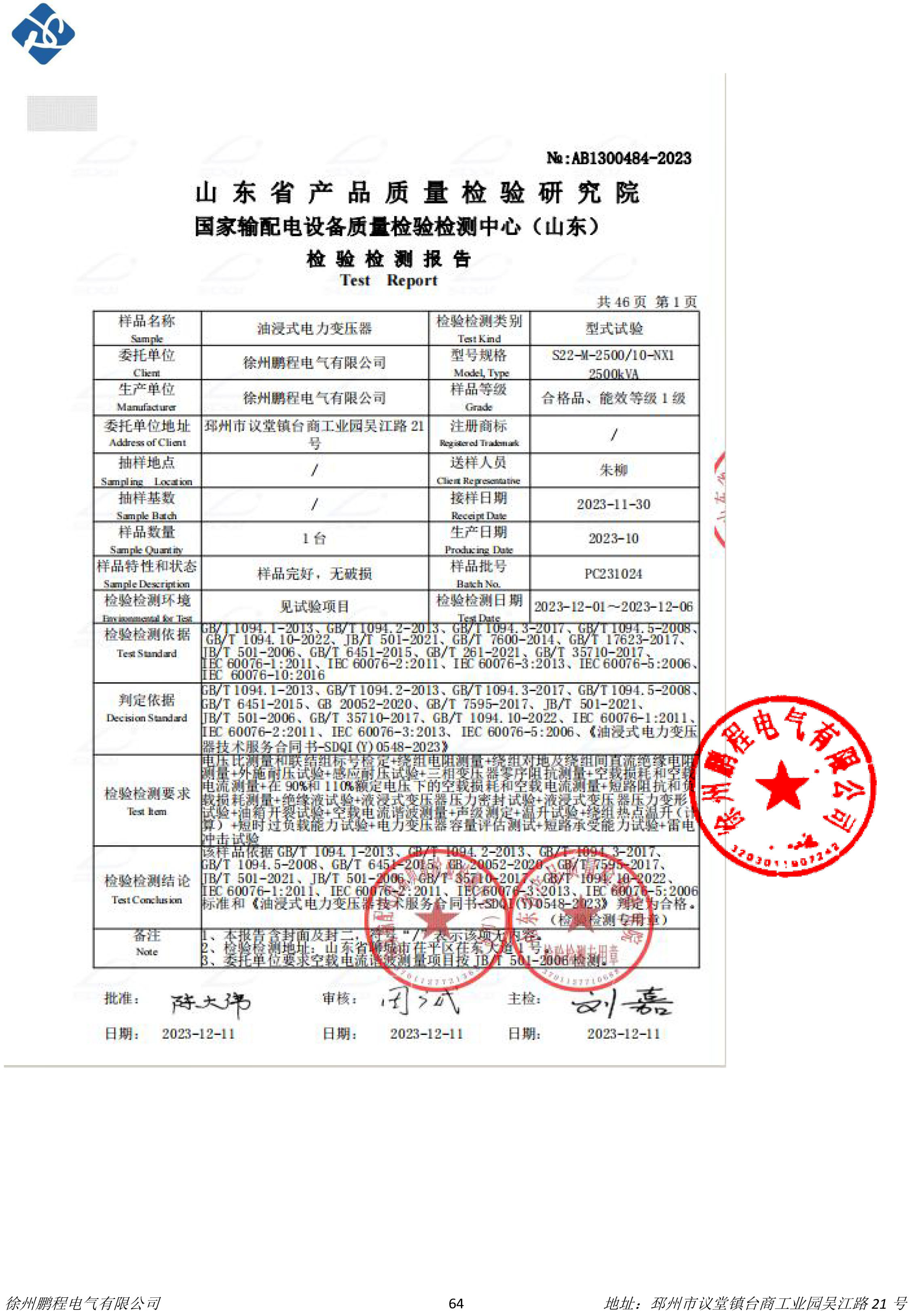 徐州鹏程电气有限公司取得S22-2500/10/0.4变压器一级能效资质